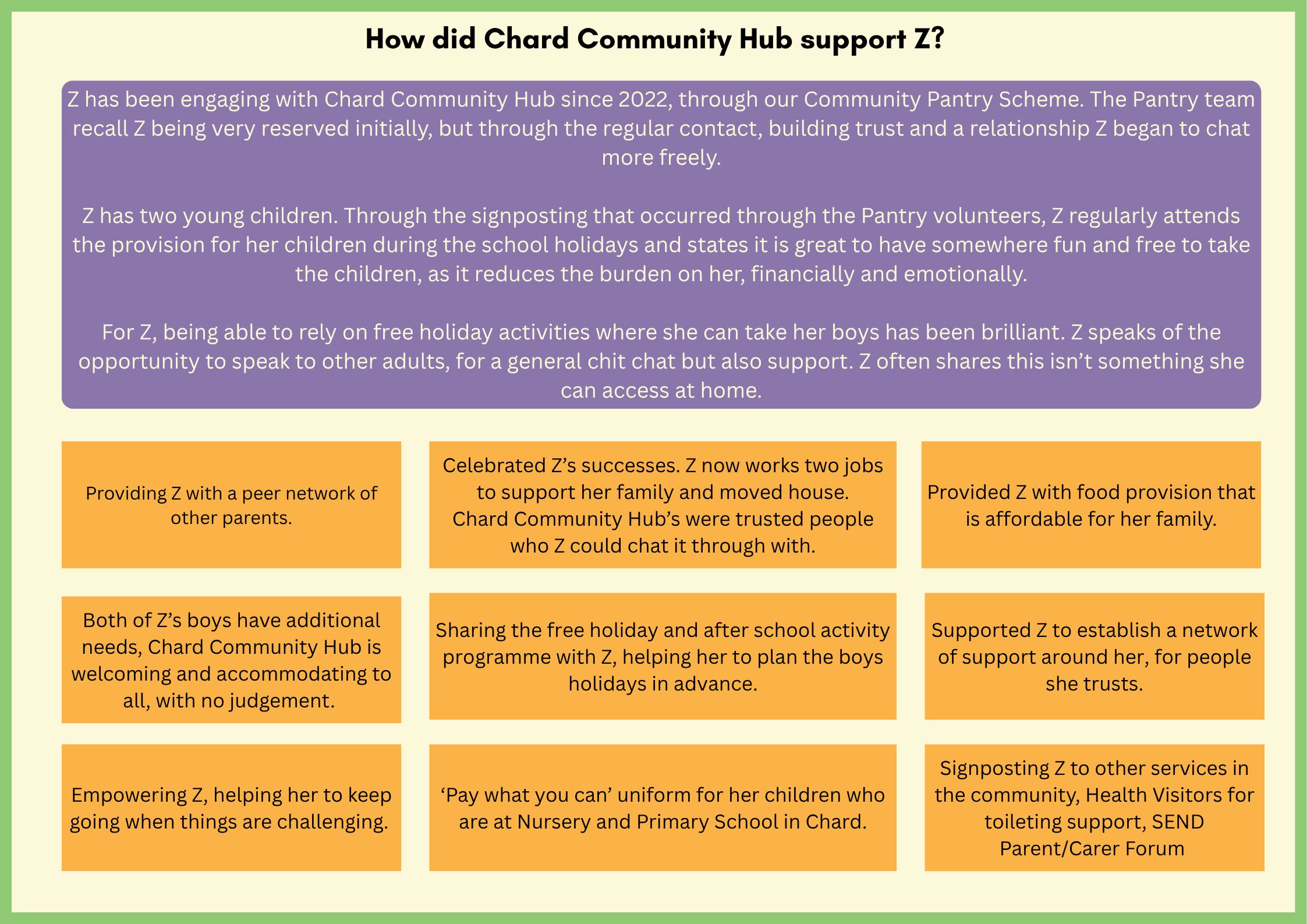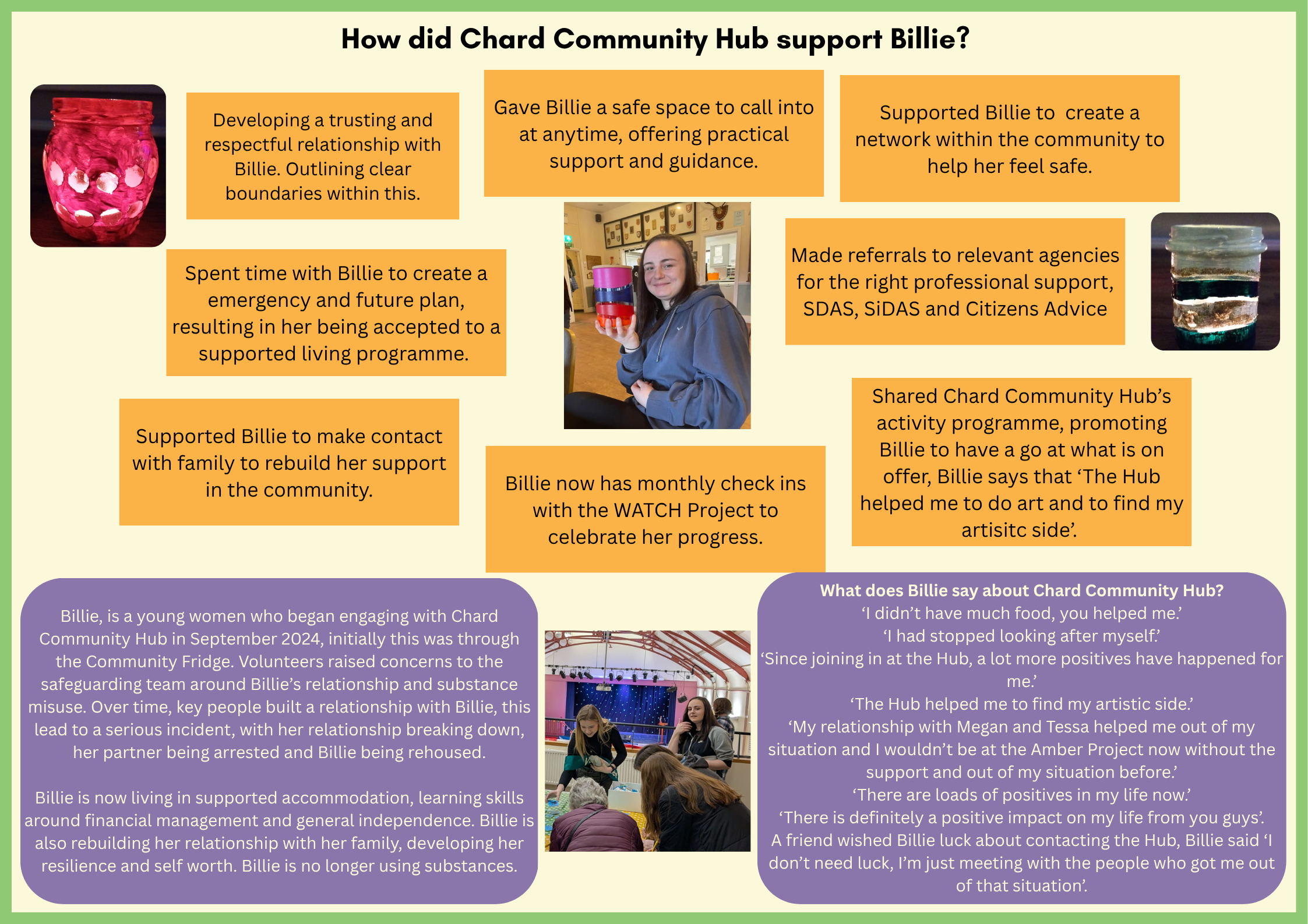At Chard Community Hub, every story matters. This page celebrates the real-life moments where support, kindness, and community spirit have made a lasting difference. From helping families through tough times to creating opportunities for growth and connection, these case studies show what happens when we come together. Explore these inspiring stories and see how your involvement can change lives—because together, we make Chard stronger